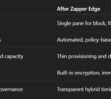 "Is storage complexity disrupting IT? Zapper Edge addresses lifecycle management, scaling, and unpredictable costs—turning persistent headaches into streamlined, cost-optimized storage operations."