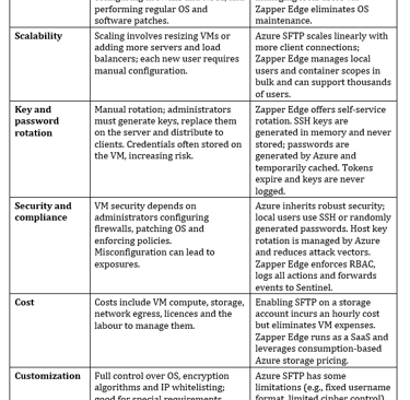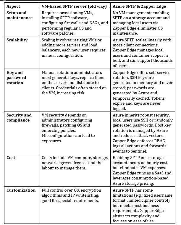 Comparing native SFTP on Azure Blob Storage with a non‑native VM‑based SFTP server provides a concise cost‑benefit analysis. The key differences, augmented by Zapper Edge’s implementation, are summarised below: