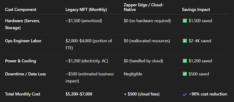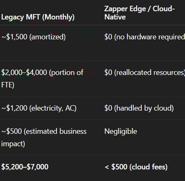 These figures show that Zapper Edge can save enterprises tens of thousands of dollars annually. Instead of sinking money into owned infrastructure and its upkeep, you pay a minimal fee for a service that is fully managed and far more reliable. Even if an organization’s legacy setup is a bit more optimized than the example, the shift to cloud MFT still offloads costs like: