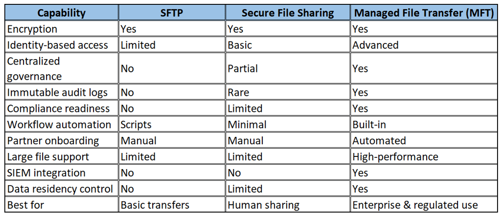 Managed File Transfer (MFT) → enterprise-grade, compliant, automated, and auditable file movement