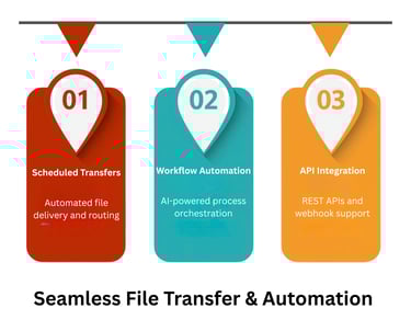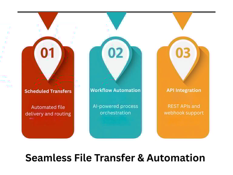 Schedule and trigger file transfers via API with automated notifications and workflow orchestration. Our platform enables seamless integration with your existing systems through comprehensive APIs and webhook support.